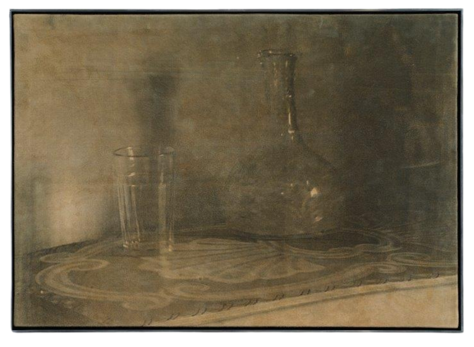 Poppy Jones prints images onto suede, yet her images seem to blush from within. Her prints teeter on thresholds: between photography and painting, between surface and stain, between light and shadow. Printmaking is, itself, a threshold between an image and its opposite, between a memory and its impression. Jones imprints into these antitheses. In Solid Objects, a glass decanter is anything but: it melts into the sultry background. Jones’s objects appear not pinned down but instead slip on the suede, their edges blurring like the soft makeup in 1980s films. A lemon is nostalgic, a tulip anachronistic, when their outlines are indefinite. They refuse today’s sharp resolution but instead seem to float continuously between then and now, in the corner of my vision. It is hard to know if this is Jones’s memory or mine, yesterday or ten years ago.