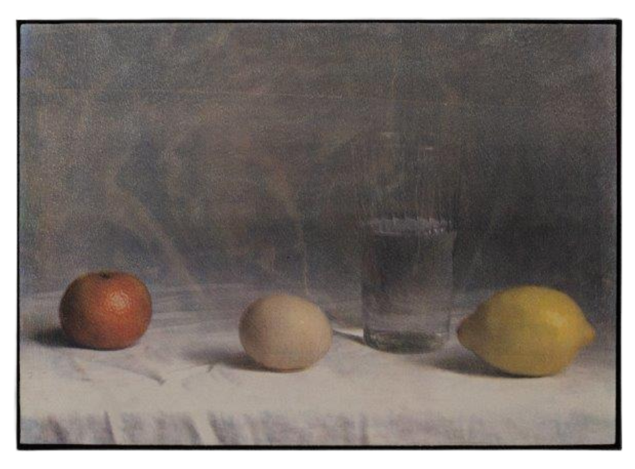 Jones captures her images to remember a fleeting moment, and reveals how we form ourselves through the banal quotidian. How it felt to be there then. Her suede is a memory in itself, cut from old clothing, a record of skin having covered skin. Skin is another threshold between our interior and the world, and inscribes time in freckles and wrinkles, scars and blemishes. In Quartet, three objects that can be peeled rest on a tablecloth beside a glass of water: an egg, a tangerine, a lemon. The skin of the tangerine puckers under a light source. This could be a 17th-century allegorical painting by Zurbarán, or yesterday’s breakfast. It could be named for T.S. Eliot’s Four Quartets, which cycles through the trappings of time, or Jean Rhys’s novel where the protagonist, Marya Zelli, drifts unreal through 1920s Paris. In their ubiquitous privacy, Jones’s still-lifes testify to the repetition of living: the boiling of an egg, the filling of a glass, the light raking through the window there at that time of morning.