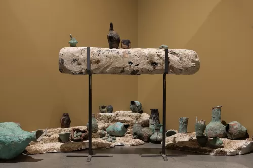 Emii Alrai works primarily in sculpture and installation, exploring Middle Eastern mythologies, archaeology and Western museum structures.