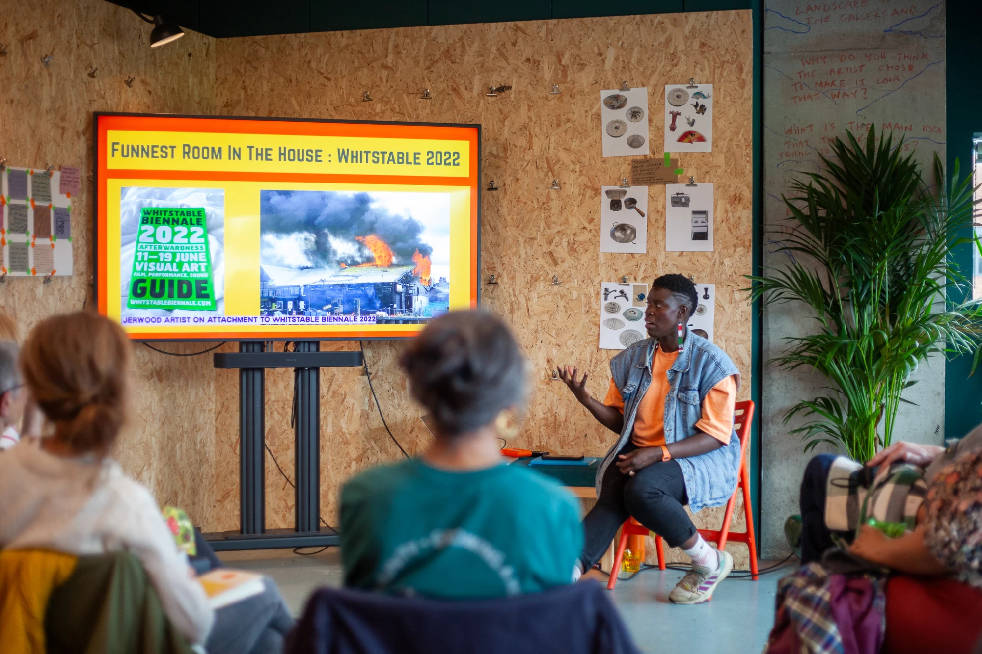 Initially conceived at the end of an arts mentorship programme with Jerwood Arts and The Whitstable Biennale in 2022, the project takes inspiration from the kitchens of Nabirye’s childhood and those of the diaspora. The Funnest Room in the House was almost completed when it was tragically destroyed by fire a few weeks before its premier.