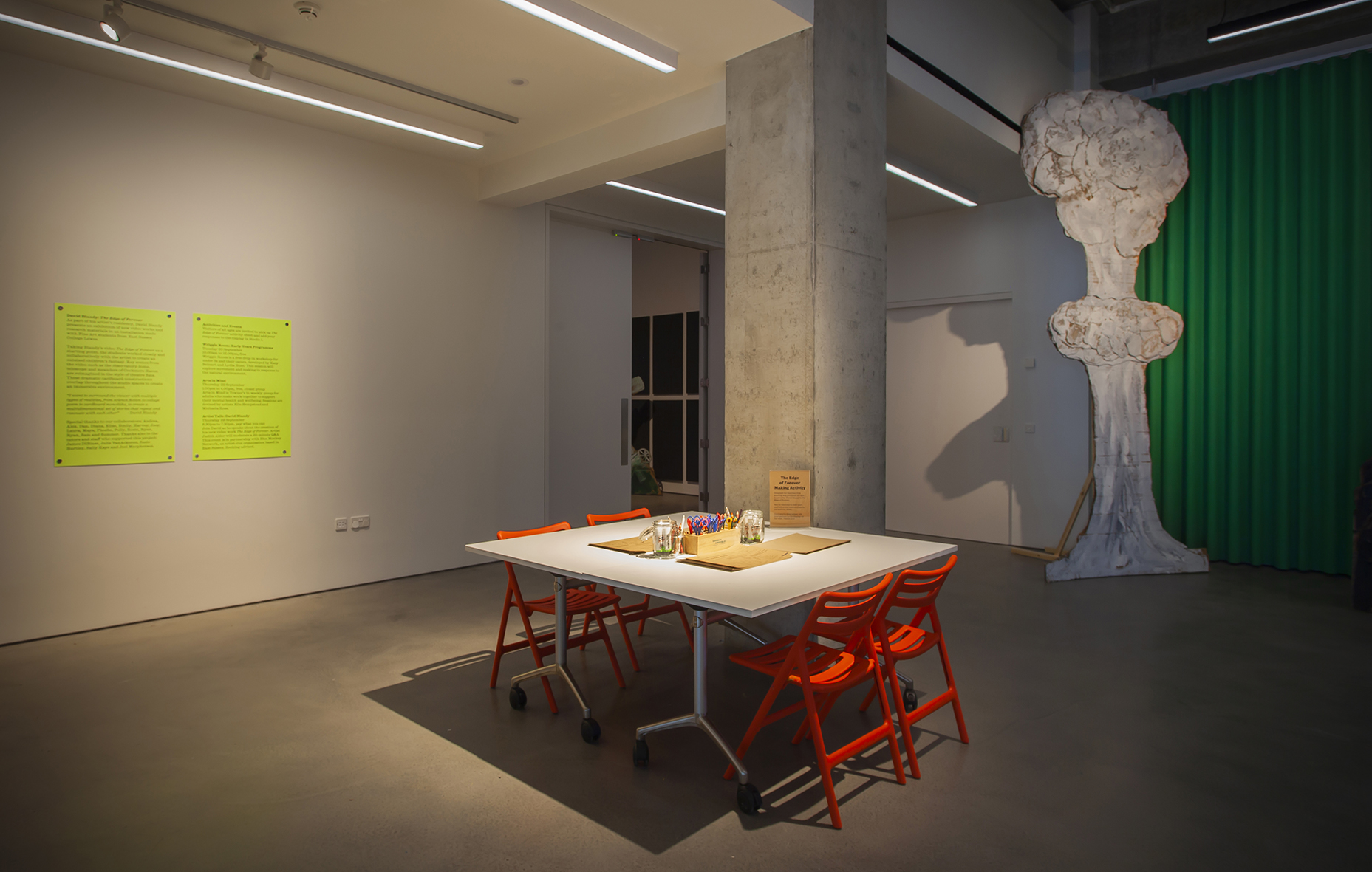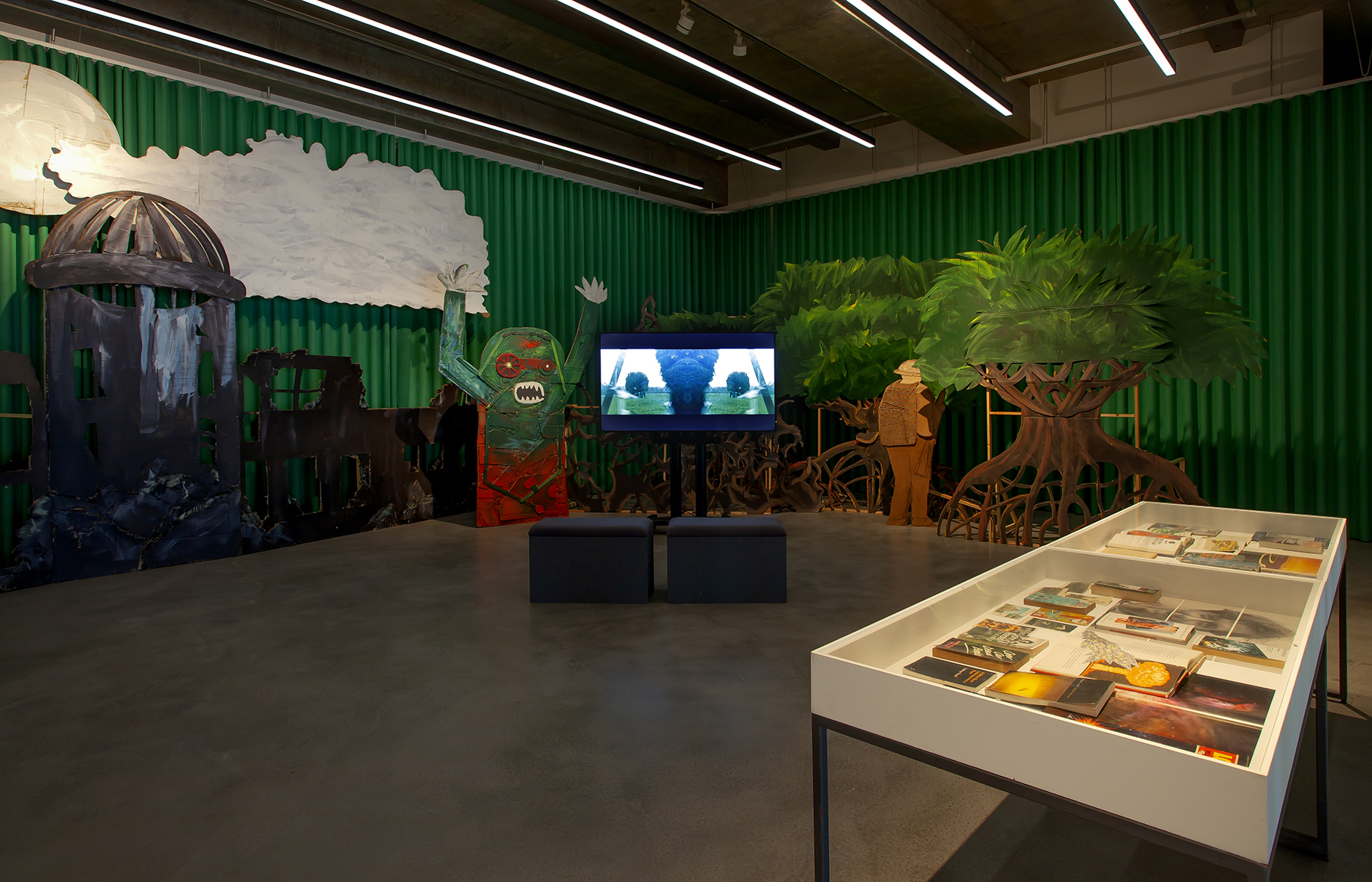 The exhibition also includes a collaboration with Fine Art students from East Sussex College Lewes. The students worked closely with Blandy to create an outsized children’s fantasy. Together they reimagined key scenes from the film, enlarged and built out of cardboard, from observatory domes, mangrove roots to figures, all rendered in the style of theatre flats, that will populate the ground floor studios