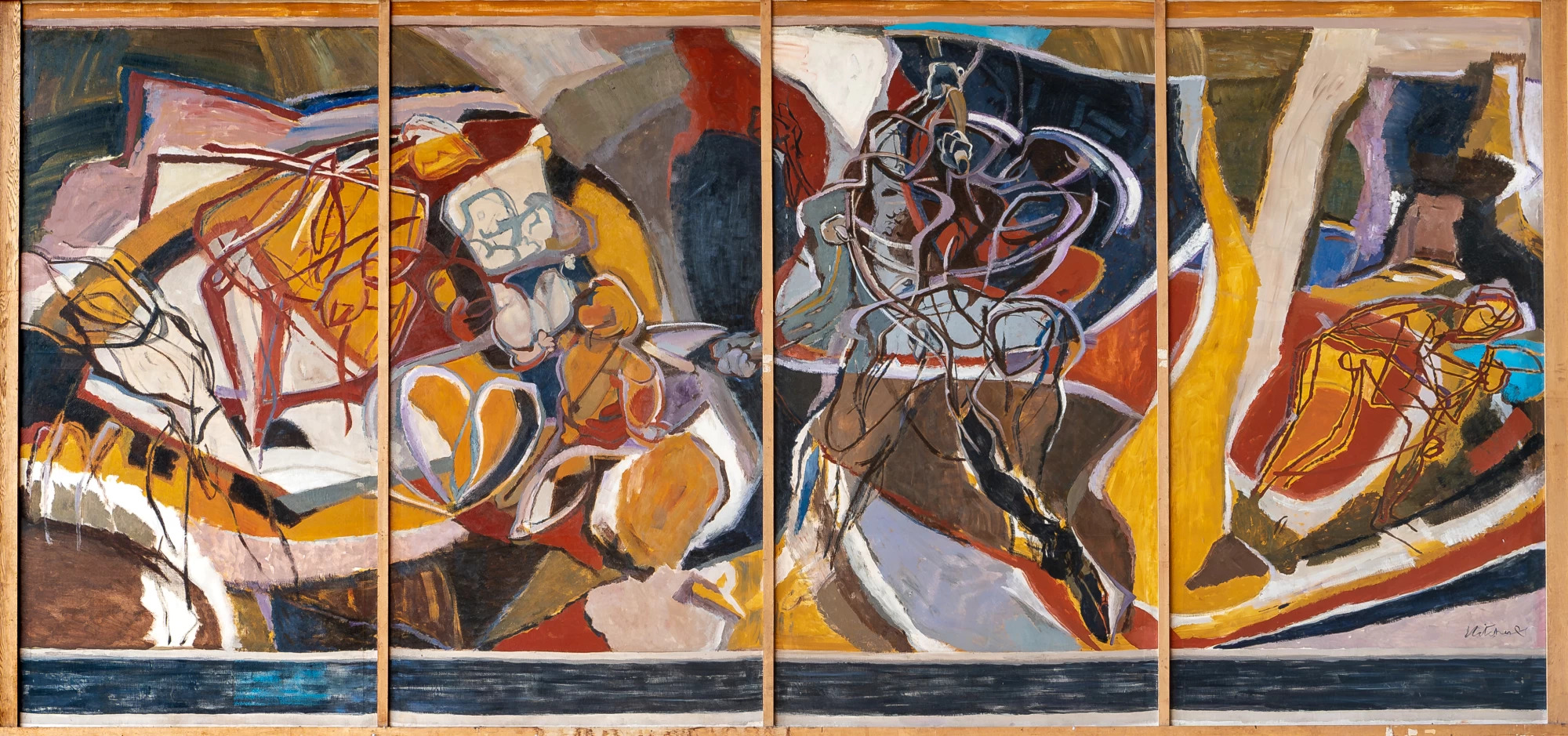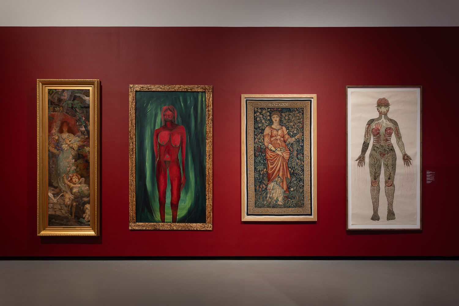 A monumental head carved in stone by Jacob Epstein (1910) shares a space with a seven-metre-long painting by Ivon Hitchens (1960) and a large wall hanging made with cellophane by Ethel Mairet’s Workshop (1940s). A magical woodland scene by surrealist Carlyle Brown (1948) appears alongside an Edward Burne-Jones tapestry (1886), a film by Neo-Naturist Jennifer Binnie (c. 1980), and a life-sized goddess by Alexi Marshall (2024).